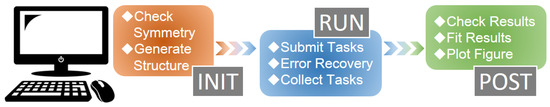 The workflow of the mech2d code is shown in Figure 2. Implemented with Python, mech2d is designed in a loosely coupled mode, which is considered easy to extend and maintain. Specifically, the workflow of mechanical properties calculation is divided into three stages, including: init, run and post. For the init stage, the initialization works are carried out. Firstly, the equilibrium crystal structure is read from the configuration file, such as POSCAR, cif, XSF format and so on. Then, the symmetry of the 2D Bravais lattice will be determined. Finally, the deformed structures will be generated according to the required parameters, including number of deformation, maximum strain amplitude, lattice type and calculation approach. In the run stage, all of the DFT tasks will be submitted to local or remote machine without manually writing the submitting script. As is known, fault tolerance is a key problem for high-throughput calculation. In the mech2d package, the basic errors of VASP during the mechanical properties calculation will be automatically fixed and resubmitted to the server. Once all of the DFT tasks are finished, the calculation results will be collected to working direction from a local or remote machine. In addition, the time-consuming run stage supports the task to restart. Specifically, tasks that are interrupted for external reasons will be submitted automatically, while the tasks that are already finished or still running will not be submitted. For the post stage, an internal DFT validator will be used to check the validity of results. Once passed the results checking, the elastic constant or stress–strain curve will be calculated, and the corresponding results will be output to texts and figures. Based on an object-oriented design rule, the mech2d mainly includes four classes, as detailed below.