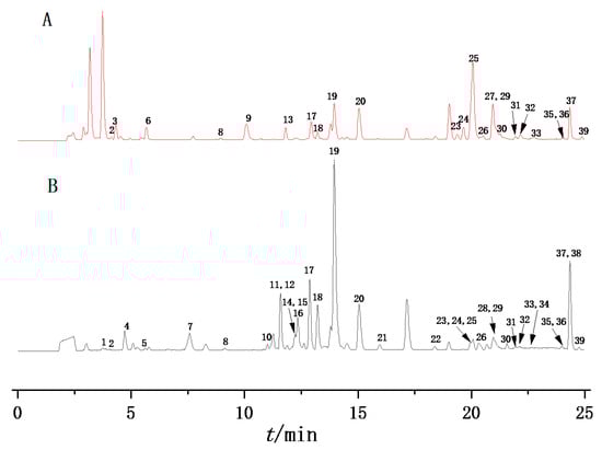 In this work, the chemical components of raw and processed PCH samples were detected and identified by UPLC-Q-Exactive-MS/MS in both positive and negative ion modes. The positive ion showed a preferable detection effect with the peak purity and number of detected peaks. The total ion currents (TICs) of the raw and processed PCH samples are shown in Figure 1. In total, 39 compounds were detected, and 33 of them were identified, including flavonoids, alkaloids, coumarins, fatty acids, benzene, substituted derivatives and other compounds. Of these, compounds 9 and 19 were unambiguously identified by comparison with reference standards. The detailed information of these compounds is displayed in Table 1, including fragment ions, retention time, molecular formula and so on.