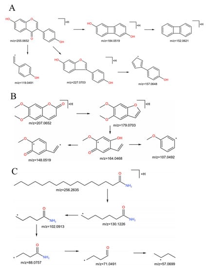 Compounds were identified according to their characteristic fragment ions compared to reported references and standards. For example, compound 9 (flavonoid) showed an [M + H]+ ion at m/z 255.06584 (C15H10O4) and exhibited fragment ions at m/z 227.07100 by the losses of CO. It also produced fragment ions at 137.0230 (1.3A+) and 119.04977 by fragmentation pathways of Retro-Diels-Alder (RDA). It can be definitively confirmed to be daidzein through comparison with the literature and reference standard. The hypothesized fragmentation process of compound 9 is displayed in Figure 2A. Compound 19 (coumarin) yielded an [M + H]+ ion at m/z 207.06589 with t formula C11H10O4, and then it lost a molecule of CO, CH3 and H2O to form a [M + H − CO]+ fragment ion of m/z 17907032, [M + H − CO − CH3]+ fragment ion of m/z 164.04680 and [M + H − CO − CH3 − H2O]+ fragment ion of m/z 148.05188. Compound 19 was unambiguously confirmed as scoparone through comparison with the literature and standard substance. The hypothesized cleavage mode of compound 19 is shown in Figure 2B. Compound 39 displayed an [M + H]+ ion at m/z 256.26447 with the formula C16H33NO, and it exhibited characteristic fragment ions at m/z 130.12366, 102.09198, and 88.07630, indicating successive losses of C9H18, C2H4, and CH2. Compound 39 was tentatively inferred to be hexadecanamide, and the hypothesized fragmentation pattern is shown in Figure 2C.