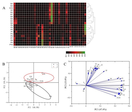 Due to chemical complexity, the differences between raw and processed PCH samples were unclear according to UHPLC-Q-Orbitrap-MS chromatograms. To distinguish the raw and processed PCH samples, a cluster heatmap was first carried out using TBtools software (TIBCO Software Inc., Palo Alto, CA, USA). In the cluster heatmap, different colors represent different content, with bright green representing higher content and dark red representing lower content. As shown in Figure 3A, the results of the cluster heatmap showed that all the samples were distributed into two major clusters. One cluster was regarded as the raw samples (G1–G10), and another cluster was considered to be the processed samples (P1–P10). It should be noted that the content of these compounds (peaks 1, 9, 11, 13, 15, 18, 19, 20, 24, 27, 28 and 39) are more than other compounds, and they may be the key compounds of differences between raw and processed PCH samples, suggesting that the chemical component and/or contents of compounds may change remarkably in the procedure of processing with black beans.