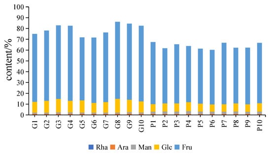 GC–MS was utilized to determine monosaccharide composition and levels in different PCH samples. The monosaccharide composition analysis revealed that the extracts of both raw and processed PCH samples primarily contained five kinds of monosaccharides, including rhamnose, arabinose, mannose, glucose and fructose, by comparison with the reference standards. The monosaccharide content hydrolyzed from the extracts is listed in Figure 4. After processing, the contents of arabinose, glucose and fructose hydrolyzed from extracts were 0.7114%, 7.3248% and 53.3072%, respectively, and were reduced by 0.25%, 3.46% and 12.70%, respectively, while the contents of rhamnose and mannose were 0.2161% and 2.2363%, respectively, and increased by 0.03% and 1.03%, respectively. Specifically, fructose was the most abundant monosaccharide hydrolyzed product in both raw and processed PCH. The monosaccharide composition and level results showed that processing had no obvious impact on the type of monosaccharides present in the extract but changed their content and ratio, which could further induce chemical structure variations, consistent with previous studies [2,24].