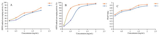 DPPH radical scavenging activity (A), ABTS radical scavenging activity (B) and Ferric reducing antioxidant power (C). G, the extract of the raw sample; P, the extract of processed sample.