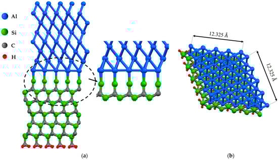 In this work, the atomic geometry and electronic structure of Al(111)/6H-SiC are calculated by the density functional theory (DFT) framework [49,50] and executed using the Spanish Initiative for Electronic Simulations with Thousands of Atoms (SIESTA) code [51,52,53]. We used the generalized-gradient approximation (GGA) function with the Perdew–Burke–Ernzerhof (PBE) [54,55] to treat the effects of correlation and electronic exchange. All atomic orbital basis sets were double-ξ plus polarization orbitals (DPZ) with a 50MeV energy shift and 0.3. A split norm [5 × 5 × 1] Monkhorst–Pack grid [56,57] was used for the k-point sampling of the Brillouin zone, and the atomic locations were relaxed until the remaining forces on any atom were smaller than 0.02 eV [58,59,60]. The cutoff of the plane-wave kinetic energy is 120 Ry in the calculations. The study employs the following cell parameters for its calculations: a = 15.406 Å, b = 13.342 Å, c = 41.993 Å, and α = 90°, β = 90°, γ = 120°. The ground state of the electrons can be found by solving the Kohn–Sham equation. Periodic boundary conditions were used with 5 × 5 supercells. The vacuum height was set to 25 Å to ensure that the z-axis of the periodic supercell is large enough and to eliminate spurious interactions between SiC/Al images periodically repeated. The generated samples are all fully relaxed in three directions before performing stress–strain calculations.