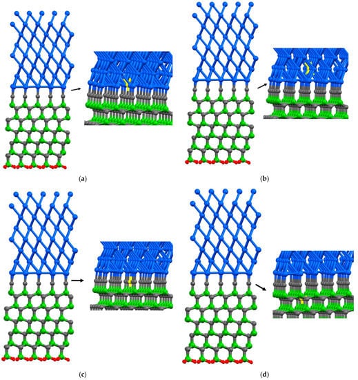 In addition, we found that the failure positions do not appear at the interfaces of the models when they are stretched. According to this, the adhesion energy of the interface does not influence the material’s brittleness. The weakest binding layers determine the material’s tensile fracture properties. For Al(111)/6H-SiC(0001) interface, the weakest position occurs between the first and the second layer at the Al side rather than the interface. The greatest elongation is found for the Si2 model in C and Si-terminated configurations. In tensile testing of Al/SiC composite materials, fractures are observed to occur in the first or second layer of Al rather than at the interface between SiC and Al. This behavior is due to the weaker bonding between the Al atoms and the SiC substrate in the first few layers on the Al side. During tensile testing, stress is first applied to the weakest binding layers of the composite material. In the case of the Al/SiC composite, the first few layers on the Al side have weaker bonding with the SiC substrate compared to the interface between SiC and Al, making these layers more susceptible to deformation and failure. At the interface between SiC and Al, there are strong covalent bonds between the carbon atoms in SiC and the aluminum atoms in Al. However, in the first few layers of Al, the bonding strength between the Al atoms and the SiC substrate is weaker, as it involves weaker Van der Waals forces and weaker metallic bonds [41,42]