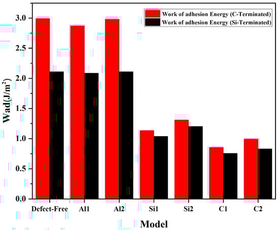 where are the total energy of the relaxed Al(111) and 6H-SiC slabs, respectively. Moreover, is the total energy of the Al(111)/6H-SiC composite after optimization. Adhesion energy for each of the vacancy positions and the defect-free is shown in Figure 5.