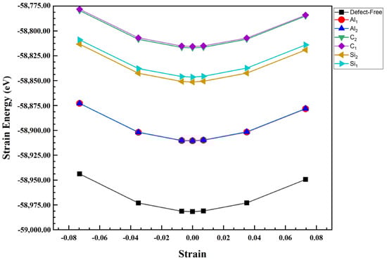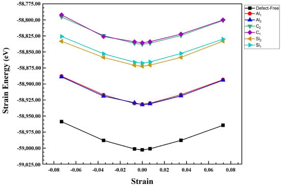 We also calculated Young’s modulus of the Al/SiC. For this purpose, all these composite configurations were compressed and then stretched along the z direction with a small increment (1.00709 Å) [34,35,36]. Finally, the strain energy for each strain value was plotted as shown in Figure 6 and Figure 7. Generally, Young’s modulus can be calculated as the second derivative of the total energy of the systems over the equilibrium volume, where ε is the strain as illustrated in the following formula [37]: