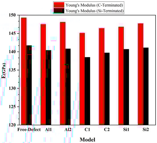 where V is defined as the volume of the Al/SiC supercell, U is potential energy, and ε = ΔL/L0, in which ΔL is changed in bond length concerning the initial bond length. It should be noted that these total energy values were fit to a polynomial. We calculated Young’s modulus of SiC/Al according to Equation (3), Figure 8. After calculating Young’s modulus, the diagram shows that Young’s modulus in the C-terminated configuration is higher than Young’s modulus in the Si-terminated configuration. In addition, the highest value of Young’s modulus consists of defect-free and Al2, and its lowest value is related to C1 in the C and Si termination. The results show that while the defects on aluminum layers do not cause visible changes in the composite’s modulus of elasticity, the presence of vacancies on the SiC side deteriorates the elastic modulus, especially when the vacancies happen in the carbon atoms. It is noteworthy that Young’s modulus of pure silicon carbide is much higher than Young’s modulus of pure aluminum. Therefore, Young’s modulus significantly decreases when a vacancy occurs on the SiC side.