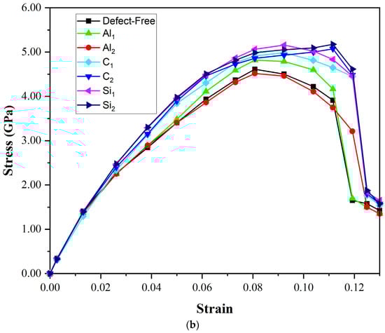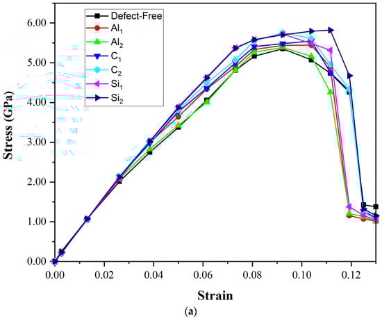 According to the Si-terminated configuration, Figure 9b, the composite with Si1 vacancies has a high tensile strength of about 5.1 GPa, and its elongation is over 0.11. Compared to the perfect composite (4.4 GPa), the tensile strength is increased steeply; however, the elongation is similar. On the SiC side, C and Si vacancies also partially improve the bonding ability of the interface. As observed, the Si vacancy at the second layer (Si2) significantly impacts the bonding performance. It can be due to the large size of the Si atom. When a Si2 atom is removed, a large vacancy is created. The vacancy can bring some lattice distortion near the point, and it eventually will affect the properties of the materials to some extent. The second-highest ultimate tensile strength curve belonged to Si1(4.9 GPa), but it has the highest elongation (over 0.12). On the aluminum side, the tensile strength at Al1(4.51 GPa) (vacancy at the interface) is higher than the tensile strength without a vacancy (4.3 GPa). When penetrating the second layer (Al2), Al vacancy significantly affects the tensile properties. During the tension process, the vacancy effect at the second layer (Al2) is similar to the situation without vacancy.