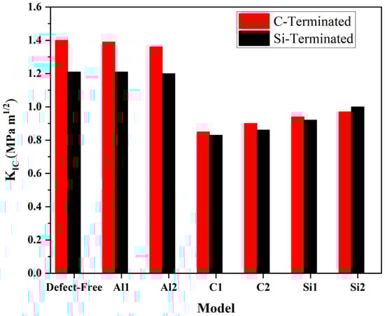According to Table 2 and Figure 10, the values of fracture toughness for C-terminated are greater than Si-terminated to some extent. Additionally, the C-termination interface has the highest surface energy. Therefore, in the C-terminated configuration, the perfect composite has the highest fracture toughness (1.40 MPa m1/2). In contrast, the smallest fracture toughness belonged to C2 (0.85 MPa m1/2). The fracture toughness of the defect-free composite and Al1 is of minor difference. However, there is a slight difference between the fracture toughness of Al1 and Al2. It can be due to the larger surface energy of Al1 compared to Al2 on the interface. In other words, the deeper the defects on the aluminum side, the more toughness can be reduced. On the other hand, the fracture toughness of the Al/SiC composite can be dramatically affected by C and Si vacancies. It can be attributed to the surface energy reduction at the interfacial area.