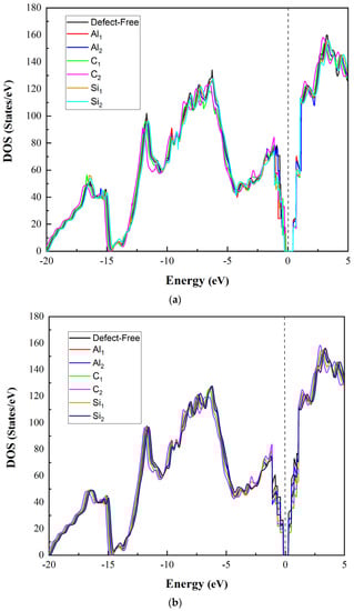 Si-terminated configurations are analogous to C-terminated ones, as shown in Figure 11b; however, the impact of Al, C, and Si vacancies is slightly weaker. Due to the Si-terminated interface’s lower adhesion energy than the C-terminated configuration, the total surface charge distribution is less affected by C, Si, and Al vacancies. There is a difference in that the sublevel Si vacancies approximately do not influence the DOS of SiC. Hence, it can be further confirmed that, for the SiC side of the Al/6H-SiC interface, the effect of the vacancies on the material is concentrated near the interface.