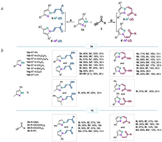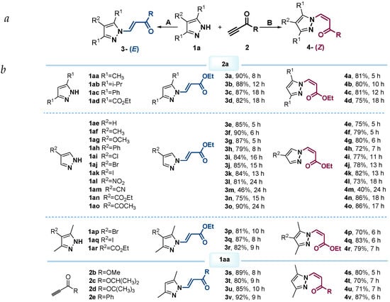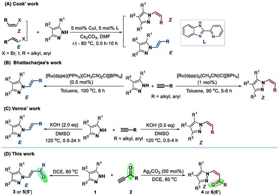 - Garg, V.; Kumar, P.; Verma, A.K. Chemo-, Regio-, and Stereoselective N-Alkenylation of Pyrazoles/Benzpyrazoles Using Activated and Unactivated Alkynes. J. Org. Chem. 2017, 82, 10247–10262. [Google Scholar] [CrossRef]