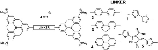 - Ferger, M.; Roger, C.; Köster, E.; Rauch, F.; Lorenzen, S.; Krummenacher, I.; Friedrich, A.; Košćak, M.; Nestić, D.; Braunschweig, H.; et al. Electron-Rich EDOT Linkers in Tetracationic bis-Triarylborane Chromophores: Influence on Water-Stability, Bio-macromolecule Sensing, and Photoinduced Cytotoxicity. Chem. Eur. J. 2022, 28, e202201130. [Google Scholar] [CrossRef] [PubMed]