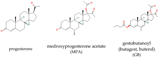 - Kareva, E.N.; Grinenko, G.S.; Gasparian, N.D.; Ovchinnikova, E.V.; Gorenkova, O.S. Influence of the structure of synthetic gestagens on their binding to progesteron receptors in the endometrium. Eksp. Klin. Farm. 2006, 69, 36–38. [Google Scholar]