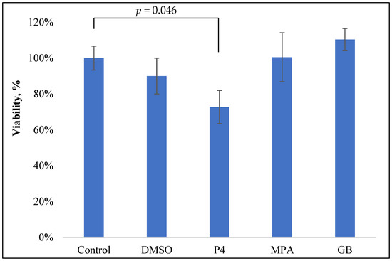 Only P4 slightly inhibited the viability of PBMCs: 28% inhibition at 10−5 M (p = 0.047). Neither GB nor MPA, nor the control solvent DMSO, influenced PBMC viability.