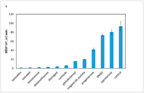 Various hormonal substances of different classes were used as reference drugs to assess the specificity of progestins: glucocorticoids (dexamethasone and cortisol), testosterone, estradiol, antiestrogen tamoxifen, pregnane progestins (MA and DG), and cyproterone acetate as progestin with antiandrogen action.