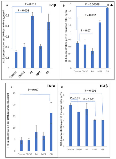 As shown in Figure 4, the progestins MPA and GB act in the same manner, demonstrating a stimulatory pro-inflammatory effect on IL-6, TNFα, and IL-1β production and inhibitory effect on TGFβ production. The influence of GB was the most pronounced towards IL-6 and TNFα stimulation. P4 demonstrated a stimulatory effect on TNFα and IL-1β production and inhibitory effect on IL-6 production, and did not influence TGFβ production.