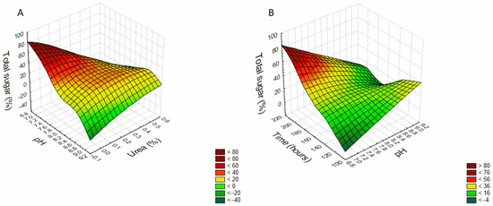 Figure 1 shows no quadratic effect in the interaction of pH and urea (%) (A) and pH and time (hours) (B) in EPS production, and, according to Equation (1), a decrease in pH and urea concentration (Figure 1A), and an increase in incubation time with a decrease in the pH (Figure 1B) enhances the production of the exopolysaccharides. The figures also show a higher production scaling up the surface, i.e., decreasing urea and pH (A) and increasing incubation time and decreasing pH (B). However, after performing production kinetics at the best condition, pH 7.4 and 0.1% urea (Figure S1), it was observed that the glucose medium was exhausted on day ten, and the EPS production consequently reduced at this time point.