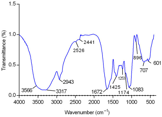 After determining the best growth condition of the fungus to produce EPS, the chemical characterization of such macromolecules was performed. The exopolysaccharides (CB-EPS) from C. brachyspora were recovered as previously described (Section 3.5). This fraction was analyzed by infrared spectroscopy (FT-IR), and it showed high absorbance at wave numbers characteristic of sugars (Figure 2), confirming the presence of polysaccharides. On the ‘sugar region’ (950–1200 cm−1), it was observed C-O stretching of pyranose rings at 1083 cm−1 [19]; while the absorbance at 896 cm−1 confirmed C-O-C stretching of glycosidic bonds, typical of fungal glucans in β-configuration [19,20,21]. Other peaks could be assigned such as C=O groups at 1672 cm−1; C-H stretching at 2943 cm−1; and an intense broadband at the range 3317–3566 cm−1 that indicated hydroxyl group [20,22].