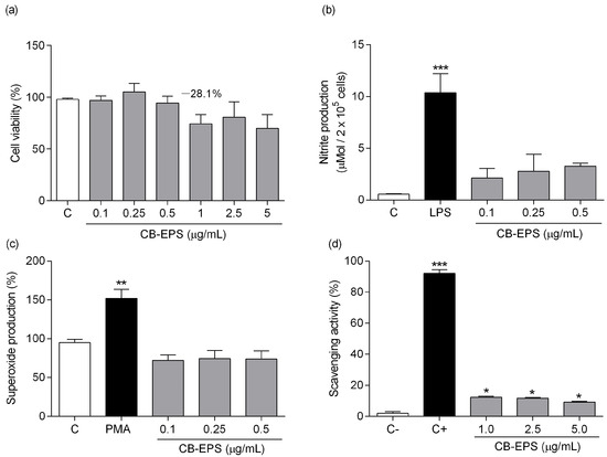 Effects of CB-EPS on macrophage viability (a), nitric oxide production (b), superoxide production (c), and scavenging activity (d). The values shown are the mean ± SEM of three independent experiments performed in triplicate. * p < 0.05; ** p < 0.01; *** p < 0.001, in comparison to the control. Control in (a–c) corresponds to the medium without CB-EPS. C+ in (d) corresponds to a reaction in which no superoxide production occurred, and C− corresponds to a reaction with superoxide production without any inhibitor.