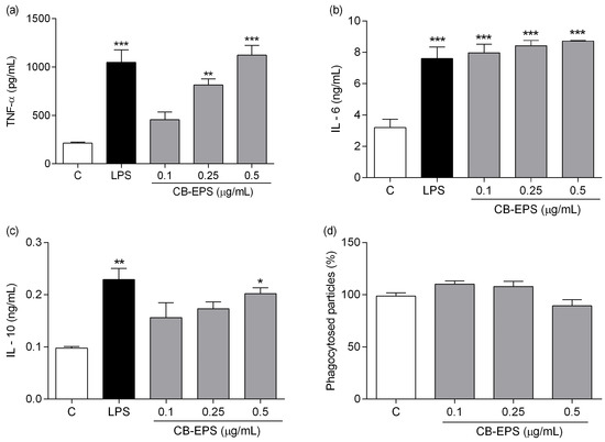 Effects of CB-EPS on macrophage production of TNF-α (a), IL-6 (b), IL-10 (c), and phagocytosis (d). The results are expressed as the mean ± SEM of three independent experiments performed in triplicate. * p < 0.05; ** p < 0.01; *** p < 0.001, in comparison to the control. Control corresponds to the medium in the absence of CB-EPS.