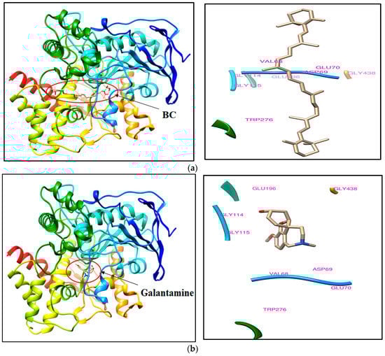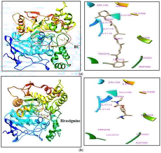 BC has been found to bind at the active site, although docking scores are low in comparison to the bound ligands. The bound ligands such as rivastigmine and galanthamine have shown tight binding affinity at the binding site of acetylcholine esterase with the values of, respectively, −7.3 and −9.8. The docking pose of BC and rivastigmine with the crystal structure of acetylcholine esterase (PDB ID: 1GQR) is illustrated in Figure 1a,b, respectively. Similarly, the docking pose of BC and galantamine with another crystal structure of acetylcholine esterase (PDB ID: 1QTI) is illustrated in Figure 2a,b, respectively.
