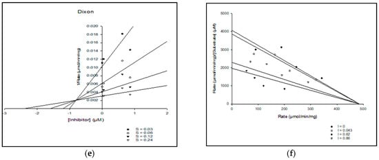 The assessment of acetylcholine esterase inhibition of BC by kinetic studies. (a) Lineweaver–Burk plot of 1/[S] vs. 1/Rate in the different concentrations of competitive-type inhibitor. (b) Hill plot of different concentrations of [S] vs. Rate (Vmax Rate) in the different concentrations of competitive-type inhibitor. (c) Hanes–Woolf plot of the compound at different concentrations of [S] vs. [S]/Rate in the different concentrations of competitive-type inhibitor. (d) Eadie–Hofstee plot of the compound by rate/[S] vs. Rate in the different concentrations of competitive-type inhibitor. (e) Dixon plot of the compound at different concentrations of competitive inhibitor vs. 1/Rate. (f) Scatard plot of the compound by Rate vs. Rate/[S] in the different concentrations of competitive-type inhibitor.