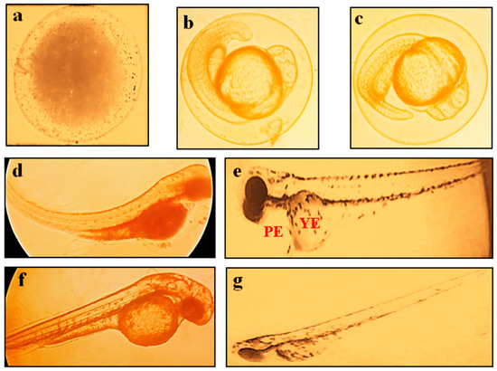 State of embryo development with exposure to BC in ZFET. (a) shows the coagulated embryo. (b,c) shows the development abnormalities, i.e., lack of tail coil detachment and dechorionation of the zebrafish embryo. (d) shows the spondylitis. (e) shows the development of PE and YE. (f) shows the eye (size reduction) deformation and abnormalities of the heartbeat. (g) shows the complete survival of the embryo without malformations. Abbreviations: PE, pericardial edema; and YE, yolk edema. The observations were made with a stereomicroscope under 40× magnification.