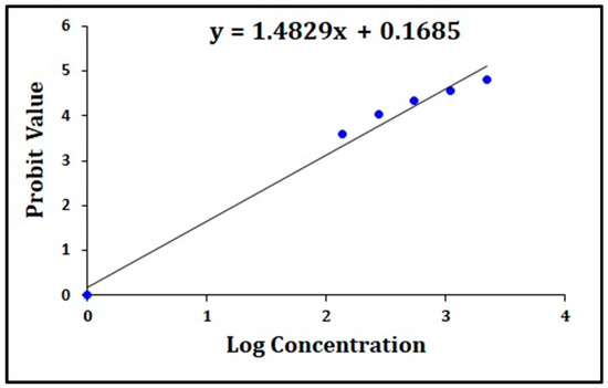 Based on this observation, the value of BC concentration and % mortality were converted to log concentration and probit values, respectively, by using Finney’s Probit analysis table chart [17]. The linear formula was obtained with log concentration (x-axis) versus probit values (y-axis) in an Excel graph. The log concentration–probit linearity graph and % mortality with the corresponding BC concentration are illustrated in Figure 5.