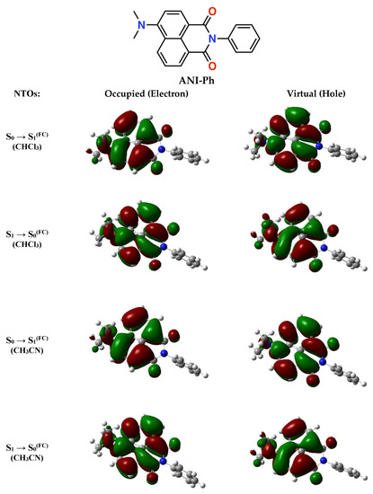 Structure of ANI-Ph, along with the natural transition orbitals (NTOs) for optical absorption, S0→S1(FC), and emission, S1→S0(FC), as obtained using the Hartree–Fock (HF) approach with a 6-31G(d,p) basis set and configuration interaction singles (CIS) method for the excited states (for details, see Supplementary Materials). The NTOs were computed for CH3CN and CHCl3 as the integral equation formalism variant of the polarizable continuum model (IEFPCM) implements. The optimized electric dipoles of the ground and excited states differ by 3.30 D and 3.60 D for CHCl3 and CH3CN (Table 1).
