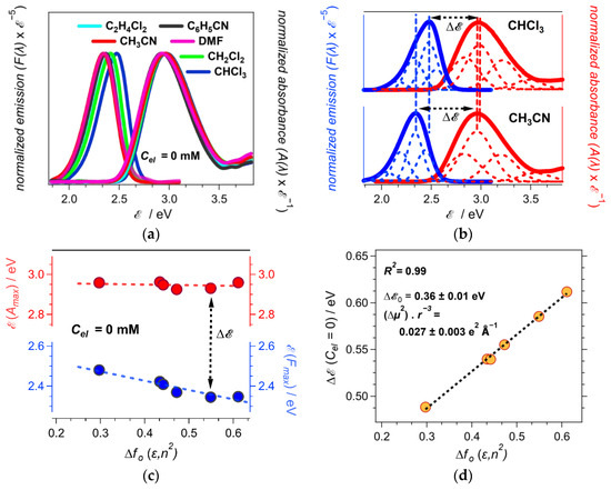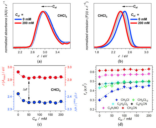 Effects of electrolyte concentration, Cel, on solution polarity as determined from the LMO formalism (Equation (4)). (a) Normalized absorption spectra of ANI-Ph for CHCl3 in the presence of different concentrations of N(n-C4H9)4PF6 (for the optical spectra for the other solvents, see Supplementary Materials). (b) Normalized fluorescence spectra of ANI-Ph for CHCl3 in the presence of different concentrations of N(n-C4H9)4PF6 (λex = 421 nm). (c) Dependence of the absorption and fluorescence maxima of ANI-Ph in CHCl3 on Cel. (d) Dependence of the Onsager polarity, fO(ε, n2), of the electrolyte solutions on Cel for the six different solvents (C3H7NO = DMF). The values of fO(ε, n2) for the different solvents and Cel are obtained by introducing the Stokes’ shifts, Δ, in Equation (4), along with the slope and the intercept that the linear analysis for neat solvents produces (Figure 2d).