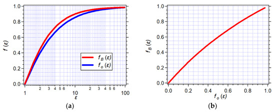 Relationship between the Born polarity, fB(ε), and the Onsager polarity, fO(ε), originating from the static dielectric properties of the media. (a) Dependence of the Born and Onsager polarities on the static dielectric constant. (b) Graphical representation of the relationship between fB(ε) and fO(ε).