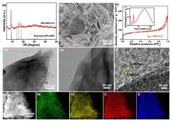 Structure and morphology of NiFe–BDC–0.5. (a) XRD patterns, (b) SEM image, (c) N2–adsorption/desorption isotherms and pore size distribution, (d) TEM image, (e) enlarged TEM image, (f) HRTEM image, (g) HAADF–STEM and corresponding elemental mappings.