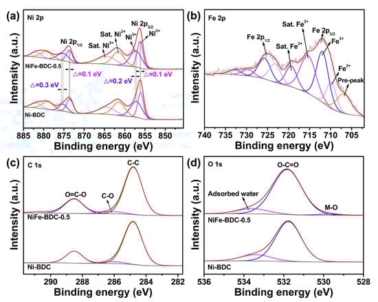 XPS spectra of (a) Ni 2p for the NiFe-BDC-0.5 and Ni-BDC, (b) Fe 2p of the NiFe-BDC-0.5, (c) C 1s, and (d) O 1s for the NiFe-BDC-0.5 and Ni-BDC.