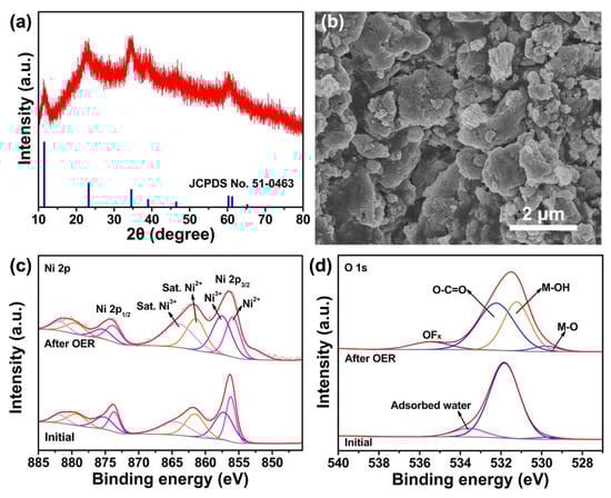 Structural and compositional analysis of the NiFe-BDC-0.5 after OER: (a) XRD patterns, (b) SEM image, XPS spectra of (c) Ni 2p and (d) O 1s.