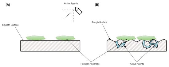 Schematic presentation of the possible use of EOs as a surface antimicrobial agent: (A) EOs sprayed at the surface and (B) long-term evaporation on a rough surface.