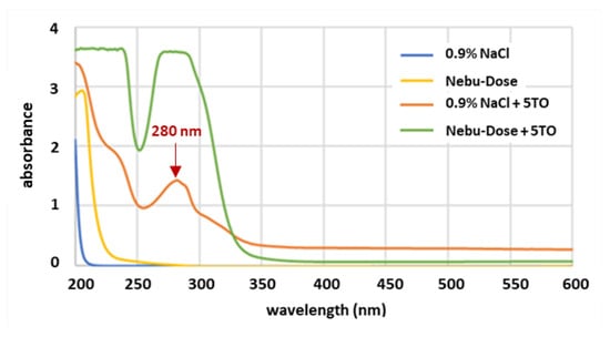 In this study, we dispersed 5TO in NDH and NaCl solutions. In opposition to the typical emulsion system [30], we did not add any surfactants or other stabilizers. It is for this reason that we named our systems dispersions. The first tests focused on the properties of dispersions intended for spraying. Figure 2 shows the UV-Vis spectra for 0.9% NaCl solution and NDH solutions with and without the addition of 0.5% 5TO. It can be observed that the signals from 0.9% NaCl and NDH are quite high, and the absorbance is over 2. We decided to study the samples as delivered, without additional dilution, to reflect natural conditions as much as possible. To reduce the signal from 5TO, in Figure 2, we present samples with concentrations of 0.5%.