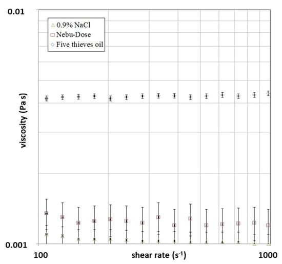 The performed overview of the literature shows that there are still not enough data on the EOs’ viscosity, as well as EOs’ compositions. The studies performed by Silva et al. [39] on EOs show that the viscosity of oils/resins from Copaifera multijuga ranges from 9.46 to 92.62 mPaꞏs. In Figure 4, the relation between the viscosity of tested solutions and the shear rate is presented. The performed analysis showed that all of the dispersion behaved like a typical Newtonian liquid. The registered dynamic viscosity for NDH was 0.0012 ± 0.0002 Pa·s; for 0.9% NaCl, it was 0.0010 ± 0.0001 Pa·s.; and for 5TO, it was 0.0042 ± 0.0001 Pa·s. Due to fast evaporation, it is difficult to perform viscosity measurements for most of the EOs, and the data presented here can be applied, i.e., for further spray or nebulizer systems’ development. It should be highlighted that the viscosity affects the droplet formation (this is discussed in the following sections) and that the droplet size is one of the key factors for the antimicrobial properties of the applied surface liquids. Furthermore, viscosity measurements performed in environmental conditions are supportive for designing new antimicrobial agents; i.e., these could be applied to prevent hospital or health service infections. Noteworthy is the fact that EOs are considered an alternative to commonly used antibacterial and antiviral agents for antibiotic-resistant bacteria, such as Klebsiella pneumoniae [40].