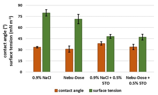 Further studies focused on characterizing the optical properties of solutions and emulsions. Table 1 shows the values of the refractive index (RI) and turbidity. It can be observed that the presence of hyaluronic acid in Nebu-Dose increased the RI compared to samples with only NaCl. However, the effect of the addition of 5TO was nondenominational, as it resulted in a decrease in the RI for the isotonic NaCl solution and, in turn, an increase for the Nebu-Dose solution. By observing the turbidity values, it can be seen that they increase from a level not exceeding 1 (for solutions without 5TO) to nearly 150 for the 5TO emulsion in NaCl and nearly 200 for 5TO in Nebu-Dose. The higher turbidity value for the latter system can be explained by the stabilizing effect of hyaluronic acid. The turbidity of emulsions is directly correlated with the droplet size [36]. The particle size limit between a transparent and cloudy (turbid) emulsion is considered to be around 100–250 nm [37,38]. In addition, the acidity of the test samples was also examined (Table 1). Nebu-Dose solutions were more acidic than NaCl solutions. At the same time, when 0.5% 5TO was added, it contributed to a slight increase in pH.