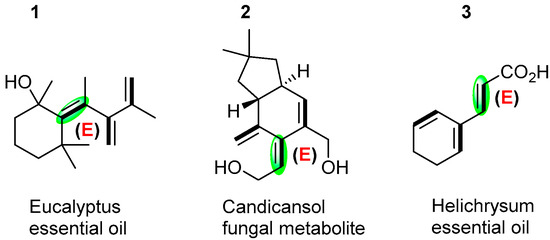 Dendralenes, commonly known as cross-conjugated oligoalkenes, are an important class of oligo-olefinic hydrocarbon structures, exclusively comprising sp2-hybridized carbons [1]. Until the turn of the century, dendralenes had received little attention, most likely due to the erroneous assumption that they were too unstable to be handled in the laboratory using standard equipment and methods [2,3]. These formations were difficult to synthesize for a long time and were believed to be unstable entities from their discovery in 1955, which limited further research. A noticeable breakthrough in the practical synthesis of dendranlenes was reported by Sherburn and co-workers in 2009, finding that dendralenes are actually stable and also have surprising reactivities [4]. Subsequently, dendralenes attracted increased interest because of their unusual structure and electronic phenomenon, with widespread applications of dendralenes in polymer chemistry [5,6], theoretical chemistry [7,8,9,10], materials chemistry [11,12], electrochemistry [13], and synthetic chemistry [14,15,16,17,18,19,20,21,22,23,24,25,26], among which, cyclo-[3]dendralene, as the primary member of the family, has attracted the greatest attention owing to its wide existence in naturally occurring products and engagement in synthetic compounds [27]. For linear dendralenes, the physical and chemical properties of the annulenes are dominated by this parity-dependent behavior. Alternation of melting points in families of compounds with even- and odd-length chains has also been reported, and this is related to the property of the packing of molecules in crystal lattices. In these systems, an alternation in behavior does not extend to any other physical or chemical property [28]. Notably, when all double bonds in a dendralene molecule are in the same plane, the endo-type dendralenes will produce significant site resistance. Single bonds will then be rotated to reduce the site resistance, making the molecule resemble a “propeller” shape. However, cyclic-dendralenes limit the rotation of the single bond, which will affect the arrangement of the double bond and the chemical properties of the molecule [28]. Although cyclic-(E)-[3]dendralenes are also important skeletons in natural products, as shown in Scheme 1 [29,30], only a handful of cases have been devoted to synthesizing these stereo-structures, sometimes with unsatisfied stereoselectivity.