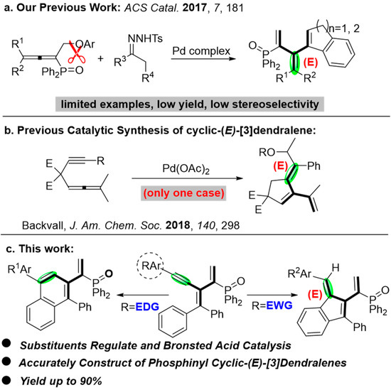 The accurate construction of cyclo-[3]dendralenes is challenging. The palladium-catalyzed coupling of allenynes is an efficient way to obtain these cross-conjugated polyenes. In particular, only two papers documented the construction of cyclic-(E)-[3]dendralenes. In 2017, our group disclosed a palladium-catalyzed coupling of allenylphosphine oxide and N-tosyl-hydrazone affording diverse phosphinyl cyclic-(E)-[3]dendralenes [29]. However, limited examples were successful in acceptable yields and stereoselectivity (Scheme 2a). Later on, Backvall’s group revealed the synthesis of cyclic-(E)-[3]dendralenes with palladium-catalyzed oxidative arylating carbocyclization of allenynes, though just one case was reported (Scheme 2b) [30].