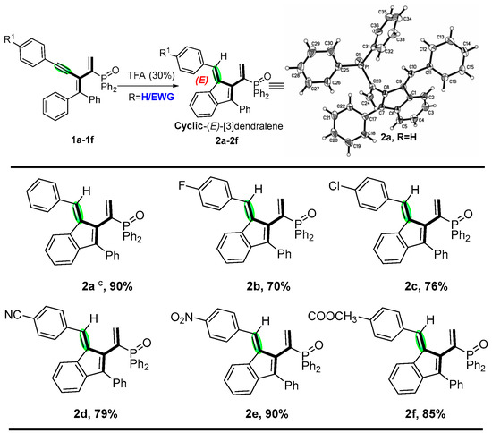Initially, phosphinyl-conjugated enynes were prepared according to our previous study, and substrate 1a was selected as a model. As shown in Table 1, solvents and acids played crucial roles in producing the target phosphinyl cyclic-(E)-[3]dendralenes. Successful research indicated that using AgSbF6 directly in 1,4-dioxane, the self-cyclization reaction produced phosphinyl cyclic-(E)-[3]dendralenes (2a) in a 78% yield (entry 3). Interestingly, DCM was proven to be the best choice and enhanced the isolated yield to 90% (entry 1). However, it is accompanied by a small amount of 3a production. As a comparison, other solvents, including DMF, acetonitrile, and toluene led to negative results. Afterward, systematic screenings of the conditions were further performed using varieties of Lewis acid catalysts (entries 6–11). Although no acid was better than that of trifluoroacetic acid, it is quite clear that weak lewis acids, such as AgCl and AgOAc, rendered the decomposition of starting materials, leading to only trace amounts of the products. The target product 2a was then achieved in yields of 40% (entry 8) and 61% (entry 9) by changing the optimum conditions and the type of Lewis acid. It is worth mentioning that a small amount of six-membered ring products (3a) appeared when the type of catalyst was changed (entry 1, entry 13), indicating that regioselective cyclization reactions might be feasible. The target product can hardly be obtained after reducing the ratios of acid catalysts from 30 to 10 mol% (entry 12). Thus, by using TFA as a promoter in DCM with no additives, an efficient self-cyclization reaction of conjugated enynes was achieved to produce phosphinyl cyclic-(E)-[3]dendralenes. Moreover, the X-ray structure of 2a was obtained, and this confirmed the relative stereochemistry of products and revealed multiple double bonds in [3]dendralenes with a “fan-like” dimensional orientation.