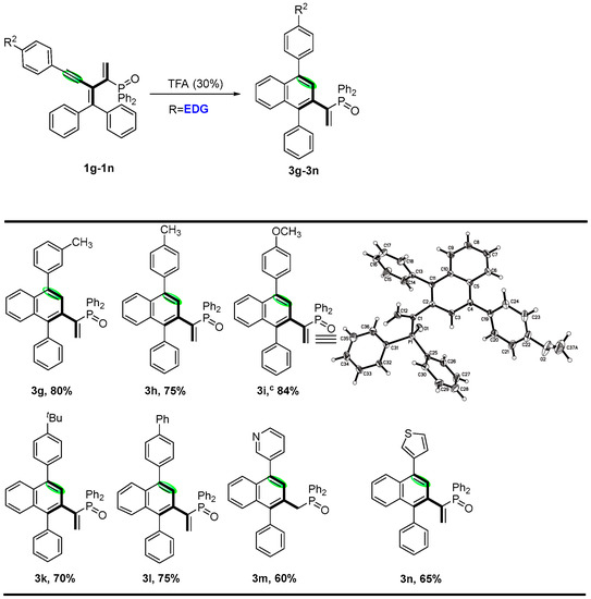 Encouraged by the preliminary results, we continued to investigate the substrate scope of various phosphinyl-conjugated enynes, and the results are depicted in Scheme 3 and Scheme 4. The stereoselectivity and dimensional orientation of all functional moieties were elucidated by the X-ray structure of 2a (CCDC 2214047). It is worth mentioning that the electronic effect of the variation in the R1 and R2 groups would render further stereodiversity to produce cyclic-[3]dendralenes. In general, good to excellent yields of the corresponding cyclic-(E)-[3]dendralene products were obtained from para-substituted aryl alkynes containing electron-withdrawing groups, such as fluorine, chlorine, and nitro (2b–e). In addition, para-substituted aryl alkynes with cyano and ester groups were also tested and, to our delight, were found to be applicable to the system, with good yields ranging from 79 to 85% (2d and 2f). We investigated the substrate scope of enynes, and the results are depicted in Scheme 4. Quite interestingly, phosphinyl-conjugated enynes bearing electron-donating groups, including methyl, methoxy, t-butyl, and phenyl at the para-positions; methyl at the meta-position was well-tolerated in the system, affording the six-membered ring products (3g–3l) in medium to excellent yields, among which, para-methoxy- and meta-methyl-derivated conjugated enynes were good candidates as well, and the corresponding products 3g and 3i were obtained in 80% and 84% yields. The stereoselectivity was elucidated through the X-ray structure of 3i (CCDC 2068909). In addition, pyridine-yl and thiophene-yl enynes were also tested, although the conditions needed to be altered and, to our delight, were found to be applicable to the system, with moderate yields (3m and 3n) ranging from 60% to 65% (see Supporting Information (SI) for details).