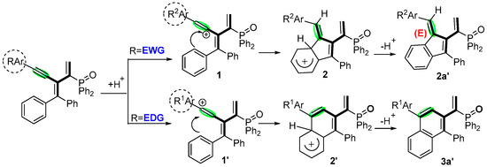 Based on the acid-catalyzed conjugated alkyne chemistry, self-cyclization process, and previous reports [38], a plausible mechanism is proposed in Scheme 6. Initially, the protonation of alkyne leads to the formation of an alkenyl carbocation species 1 and 1′. Further dearomatization of electrophilic addition intermediates 2 and 2′ gives the target products 2a′ and 3a′, respectively.