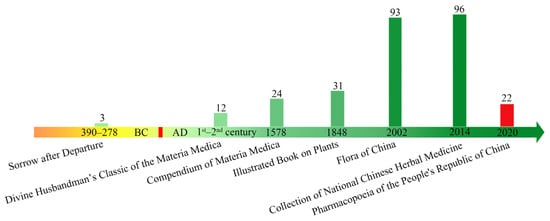 Apiaceae plants have been traditionally used as medicines in China for ca. 2400 years (Figure 1). In 390–278 BC, three Apiaceae plants, including Angelica dahurica, Ligusticum chuanxiong, and Cnidium monnieri, were first recorded as medicines in “Sorrow after Departure” [,]. With the progress of Chinese civilization, ca. 100 Apiaceae plants were historically recorded as medicines. Specifically, 12 AMPs (e.g., Angelica decursiva, Bupleurum chinense, and Centella asiatica) were recorded in the known herbal text of China, the “Divine Husbandman’s Classic of the Materia Medica (Shen Nong Ben Cao Jing)” in 1st and 2nd century AD []. In 1578 and 1848, 24 and 31 AMPs were respectively recorded in the “Compendium of Materia Medica and Illustrated Book on Plants” []. In the 21st century, the number of AMPs has been continually increasing, up to 93 species recorded in the “Flora of China” in 2002 [], and 96 species in the “Collection of National Chinese Herbal Medicine” in 2014 []. In recent years, 22 species were recorded in the “Pharmacopoeia of the People’s Republic of China” []. Specifically, 18 species are used with rhizomes and/or roots (Table 1).