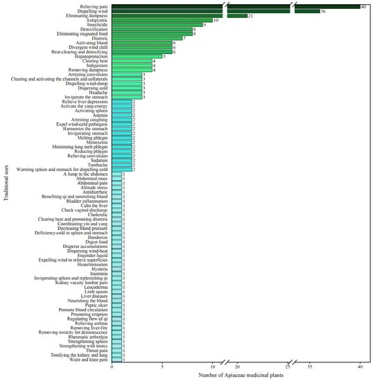 In China, Apiaceae plants have been primarily used as traditional medicines for relaxing tendons, activating blood, relieving superficial wounds, treating colds, etc. [,]. For example, rhizomatous and whole plants are mainly used for the treatment of common colds, coughs, asthma, rheumatic arthralgia, ulcers, and pyogenes infections; fruits are mainly used for regulating vital energy, promoting digestion, relieving abdominal pain, and treating parasites [,].
