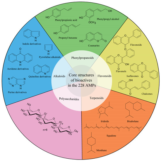 As is shown in Table 1, hundreds of bioactive metabolites have been identified from the 228 AMPs [,]. Based on their chemical structures, these metabolites can be categorized into five main classes: (1) polysaccharides, (2) alkaloids, (3) phenylpropanoids, (4) flavonoids, and (5) terpenoids (Figure 4).