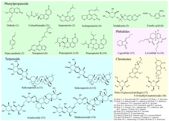 M.L. (Meiling Li) collected and analyzed the references, drew the chemical structures, and wrote the manuscript; M.L. (Min Li) checked the classification and traditional use of Apiaceae medicinal plants; L.W. checked the language and modern pharmacological use; M.L. (Mengfei Li): conceptualization, methodology, supervision, writing—review and editing; J.W.: conceptualization and project administration. All authors have read and agreed to the published version of the manuscript.