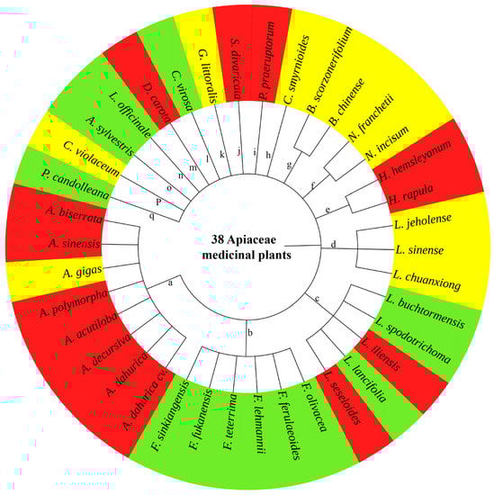 Cluster of the 38 rhizomatous AMPs affected by bolting and flowering (BF). The red color indicates that BF significantly affects the yield and quality; the yellow color indicates that BF affects the yield, though the rhizomes or roots can be used as medicine to some extent; and the green color indicates that BF has no significant effect on the yield and quality. a: Angelica, b: Ferula, c: Libanotis, d: Ligusticum, e: Heracleum, f: Notopterygium, g: Bupleurum, h: Changium, i: Peucedanum, j: Saposhnikovia, k: Glehnia, l: Cicuta, m: Daucus, n: Levisticum, o: Anthriscus, p: Chuanminshen, and q: Pimpinella.