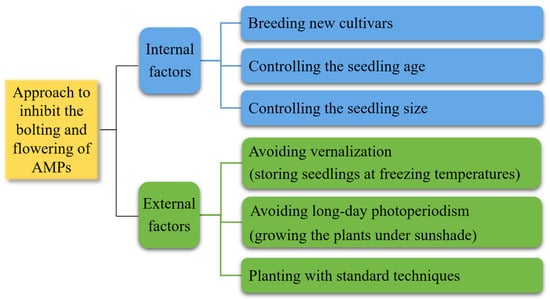 To inhibit the occurrence of BF in AMPs, several measures can be used, including breeding new cultivars, controlling the seedling age and size to delay the transition from vegetative growth to flowering, storing seedlings at freezing temperatures to avoid vernalization, growing the plants under sunshade to avoid long-day photoperiodism, and planting with standard techniques to reduce pests and diseases (Figure 7).