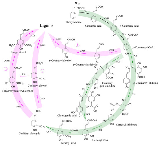 Schematic representation of biosynthetic pathways of lignins. Abbreviations: PAL, phenylalanine ammonia lyase; C4H, cinnamate 4-hydroxylase; 4CL, 4-coumarate-CoA ligase; HCT, hydroxycinnamoyl shikimate/quinate transferase; C3H, p-coumarate 3-hydroxylase; CCOMT, caffeoyl-CoA 3-O-methyltransferase; CCR, cinnamoyl-CoA reductases; CADs, cinnamyl alcohol dehydrogenases; LACs, laccases; F5H, ferulate 5-hydroxylase; COMT, caffeic acid 3-O-methyltransferase. The green color indicates the common phenylpropanoid pathway of phenylpropanoids, and the red color indicates the lignin biosynthetic sub-pathway. The ①, ② and ③ means different sub-pathways of lignin biosynthesis.